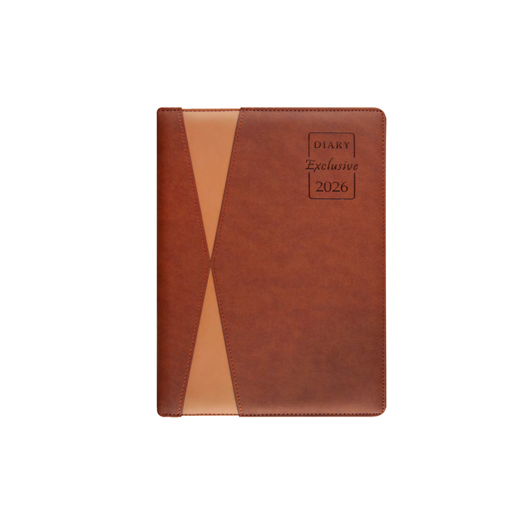 The AmberX 2026 Exclusive Leather Diary is a symbol of refined craftsmanship and executive style. Featuring a rich brown leatherette cover with tan accents in a modern diagonal design, this diary blends tradition with contemporary elegance. Sized at 18.5 × 25.0 cm, it offers a spacious layout ideal for planning, journaling, or professional use. The premium PU leather finish ensures long-lasting durability, while its sleek stitching detail adds a luxurious touch. A perfect pick for corporate gifting and daily use in 2026.