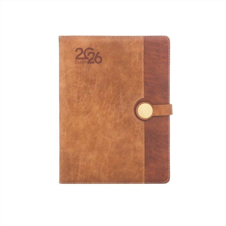 The Classic Amber 2026 Leather Diary radiates timeless elegance with its dual-tone brown PU leather cover and gold-button magnetic clasp. Crafted in a large 18.5 × 25.0 cm size, it offers a perfect blend of sophistication and functionality for everyday professionals. The rich leather texture gives it a premium feel, while the sturdy build ensures durability throughout the year. Ideal for meetings, journaling, or gifting, this diary is designed to reflect class and confidence in every detail.