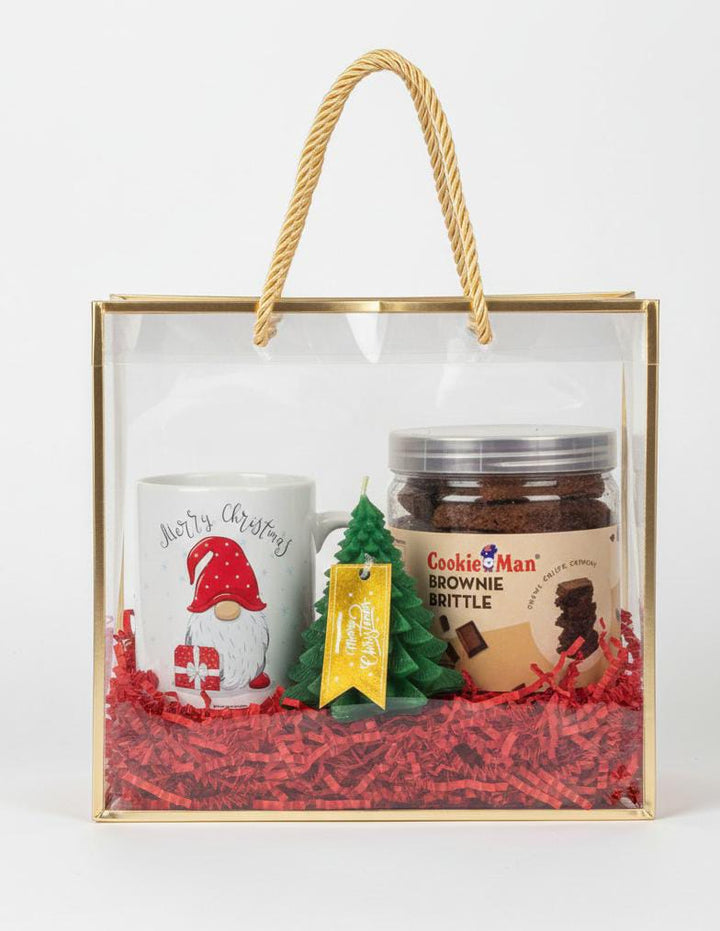 A festive mini hamper featuring a Christmas mug, a scented tree candle, and delicious CookieMan Brownie Brittle — the perfect small yet thoughtful Cristmas gift.